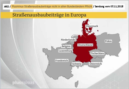 Die Grafik verdeutlicht, dass nur Deutschland und Dänemark von seinen BürgerInnen Beiträge beim Straßenausbau erheben. In allen anderen Nachbarländern wird diese Baulast von der Allgemeinheit öffentlich getragen. Weshalb bestehen wohl diese Pflichten zur Kommunalabgabe für direkte Anlieger im Straßenausbau in Deutschland immer noch partiell weiter?